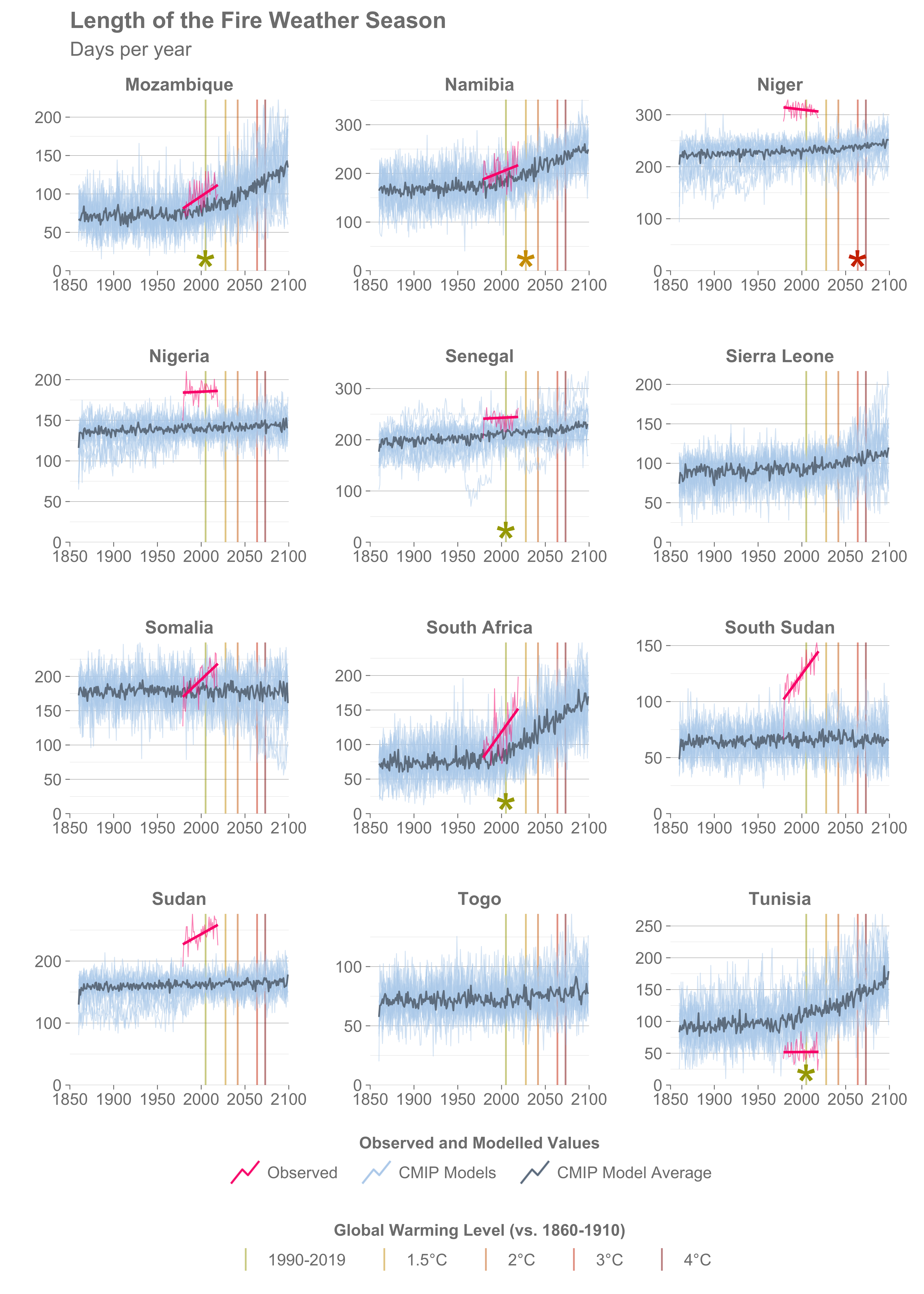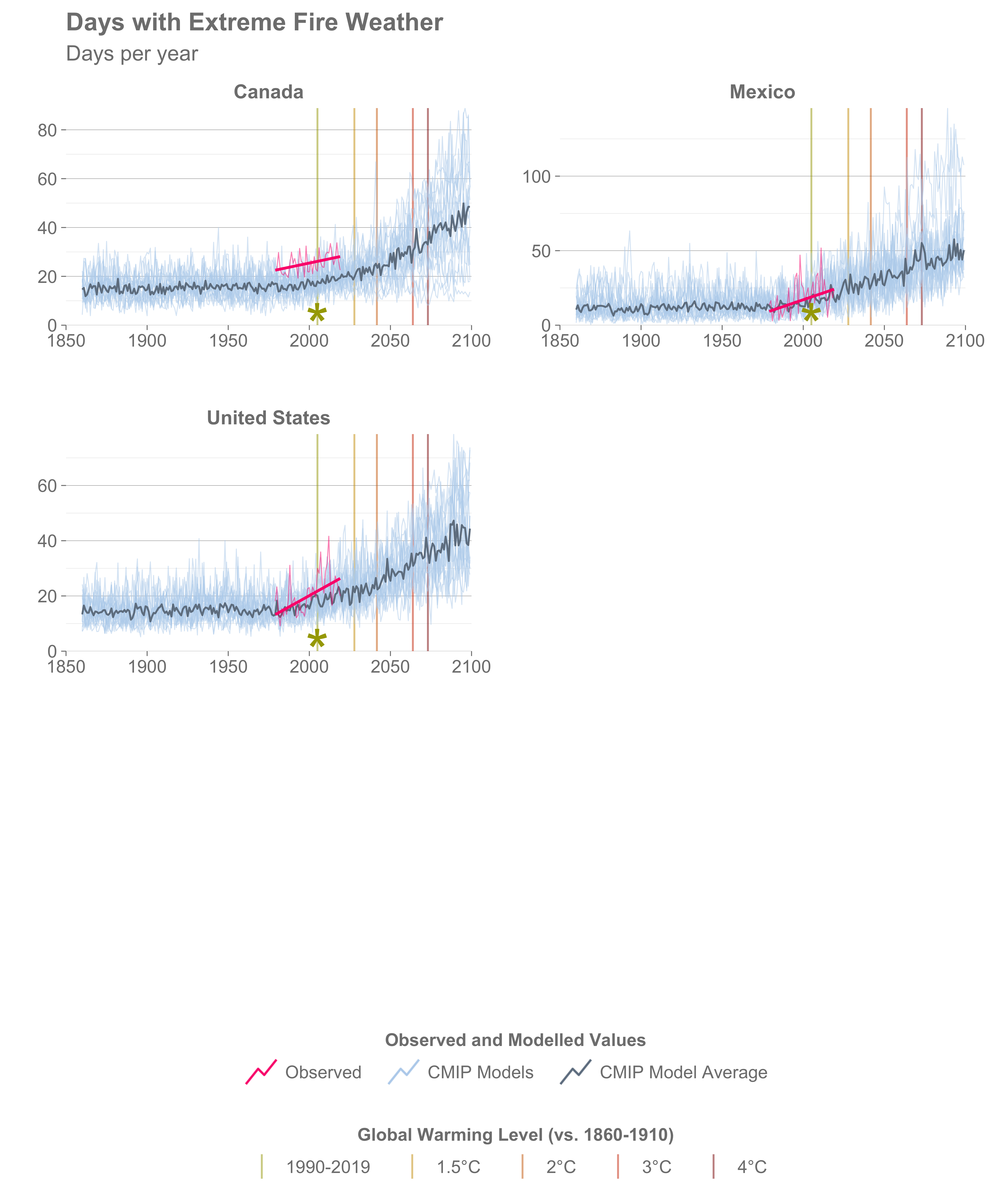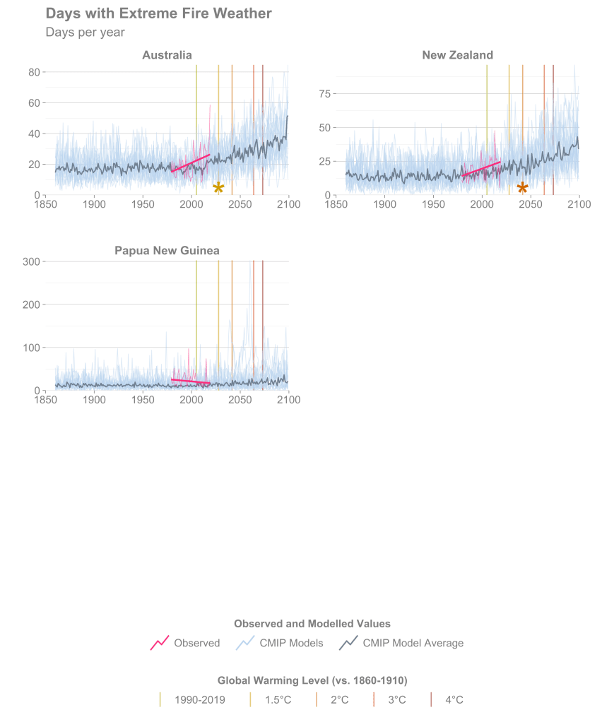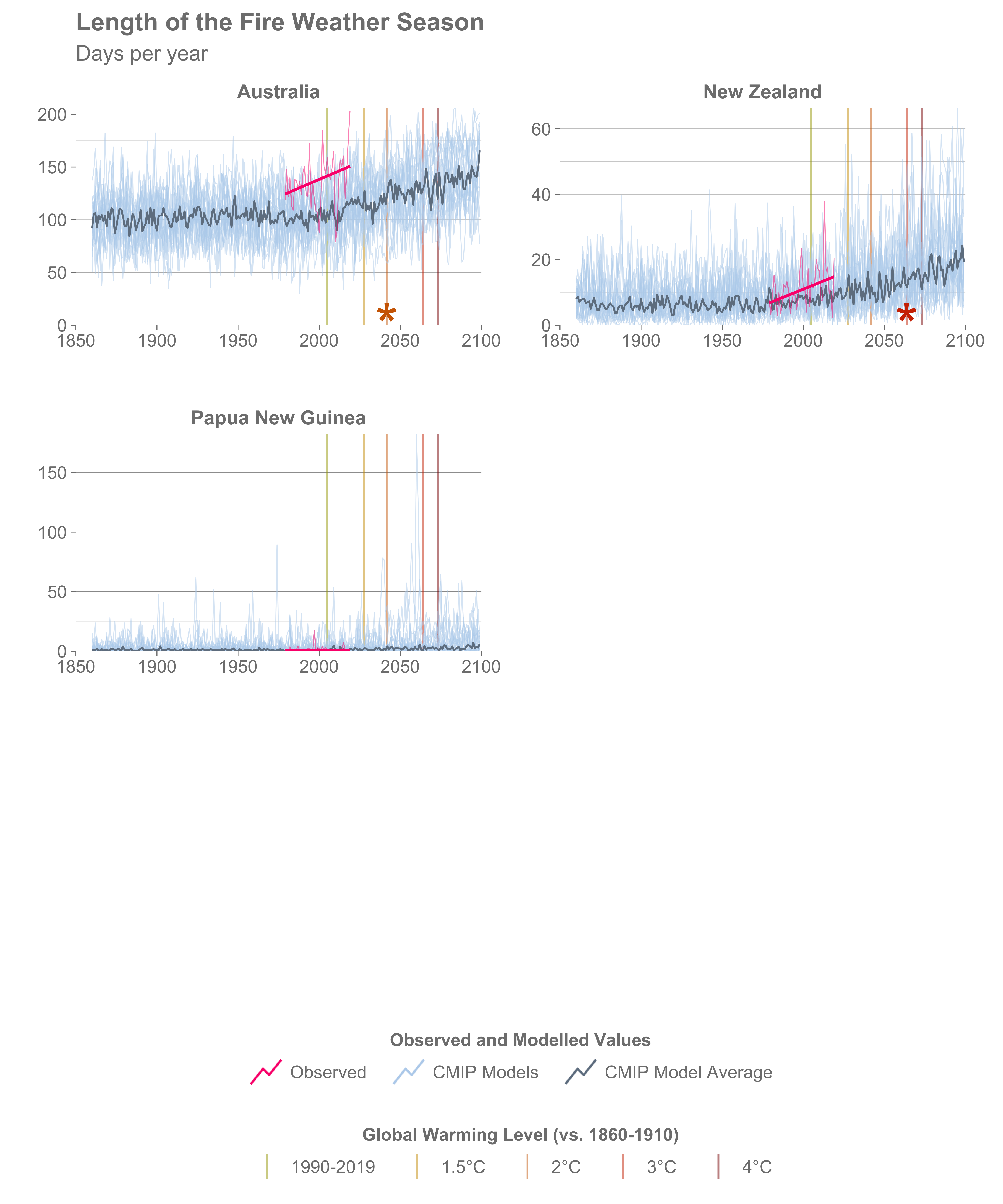 Asterisks (*) mark the year in which the fire weather metrics emerges beyond the natural variability seen in the pre-industrial period – this is essentially the period in which fire weather becomes unprecedented.