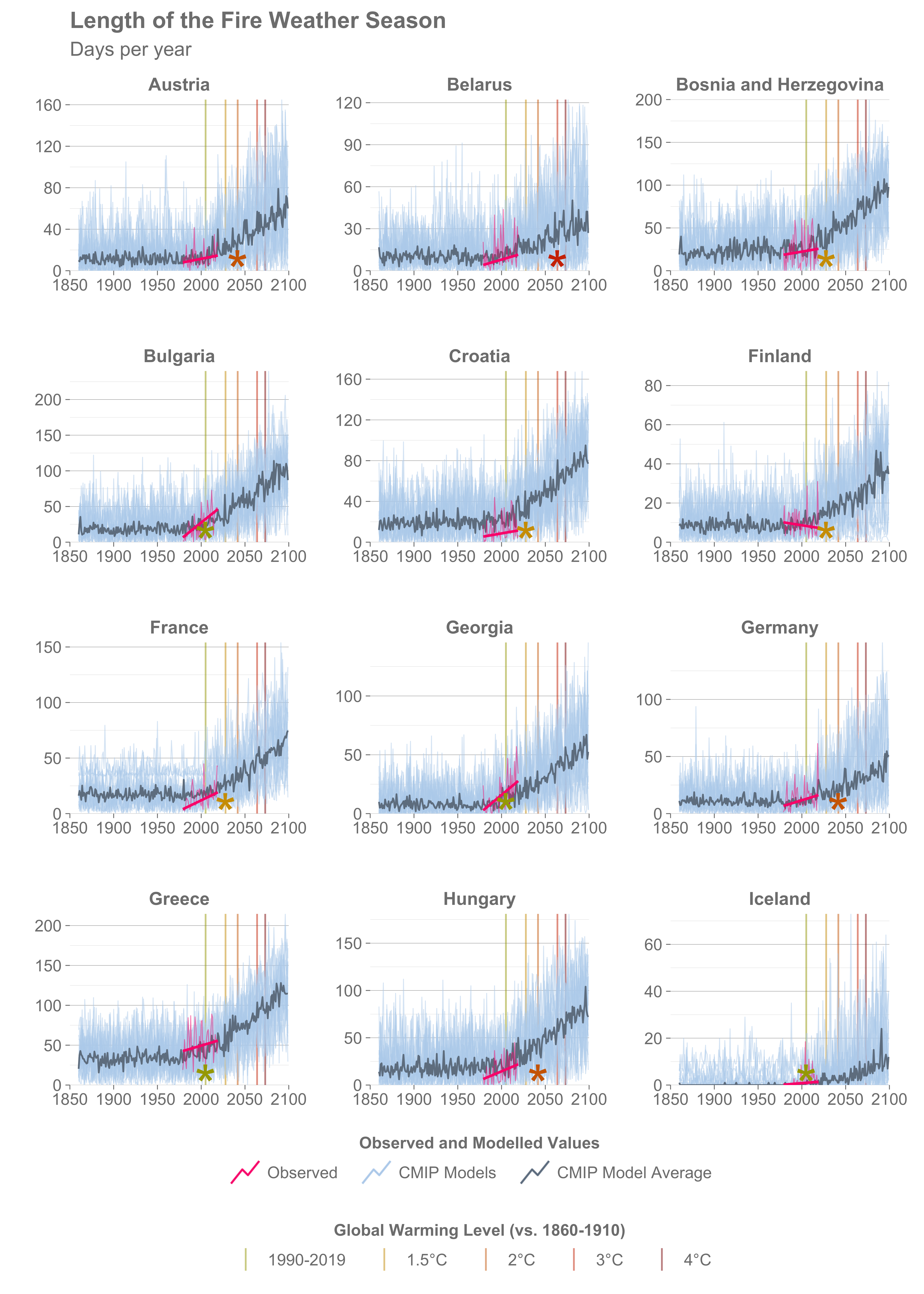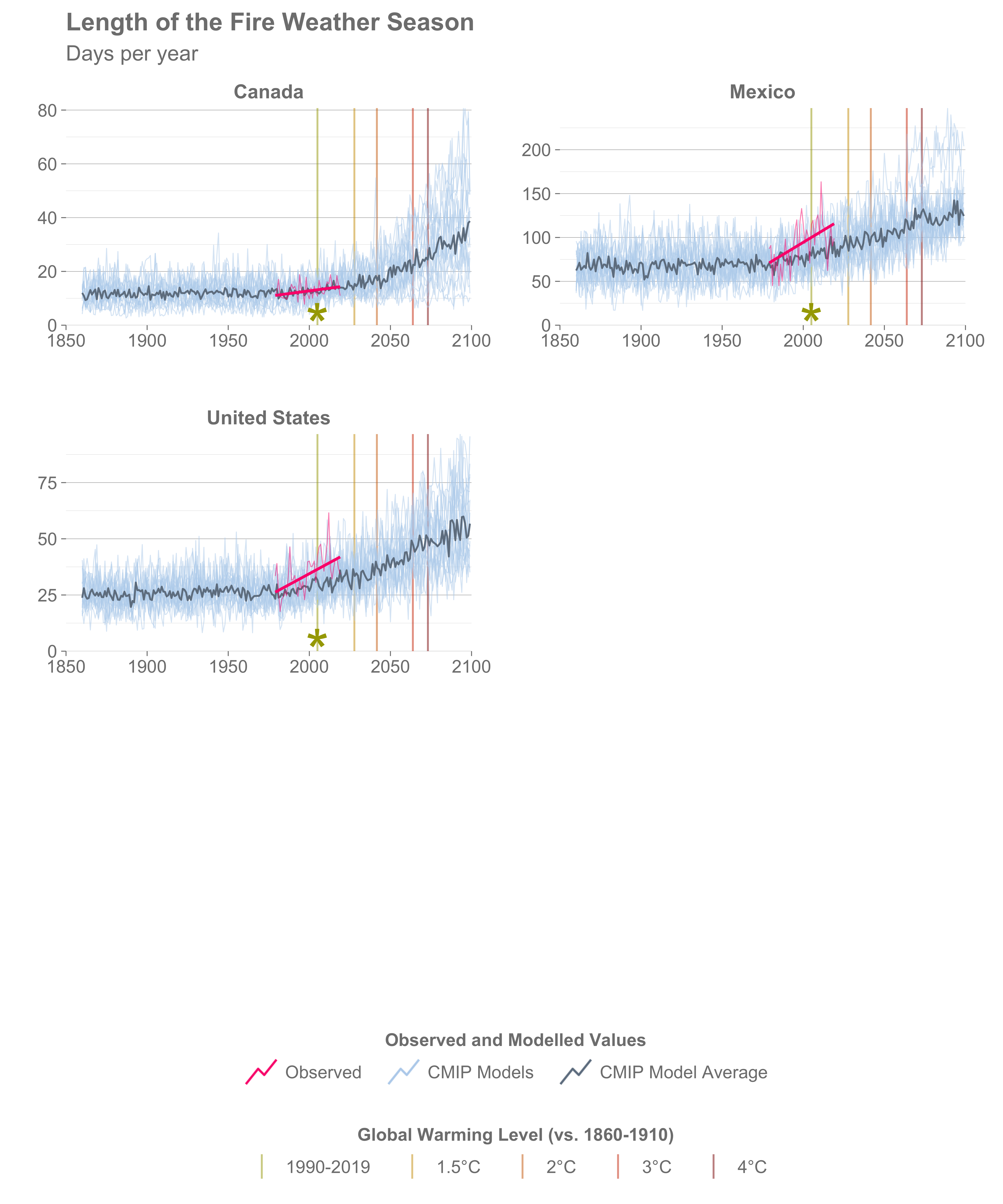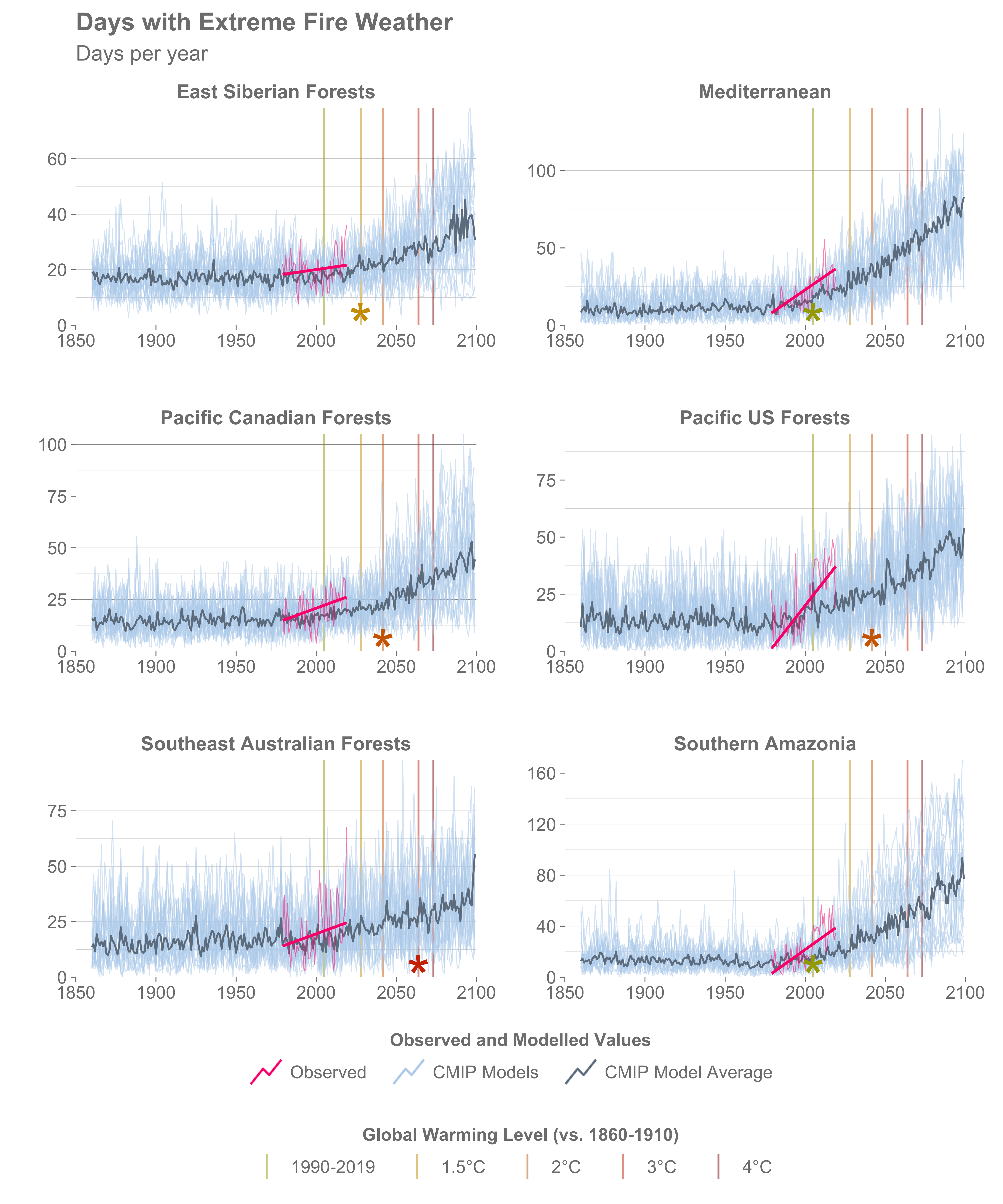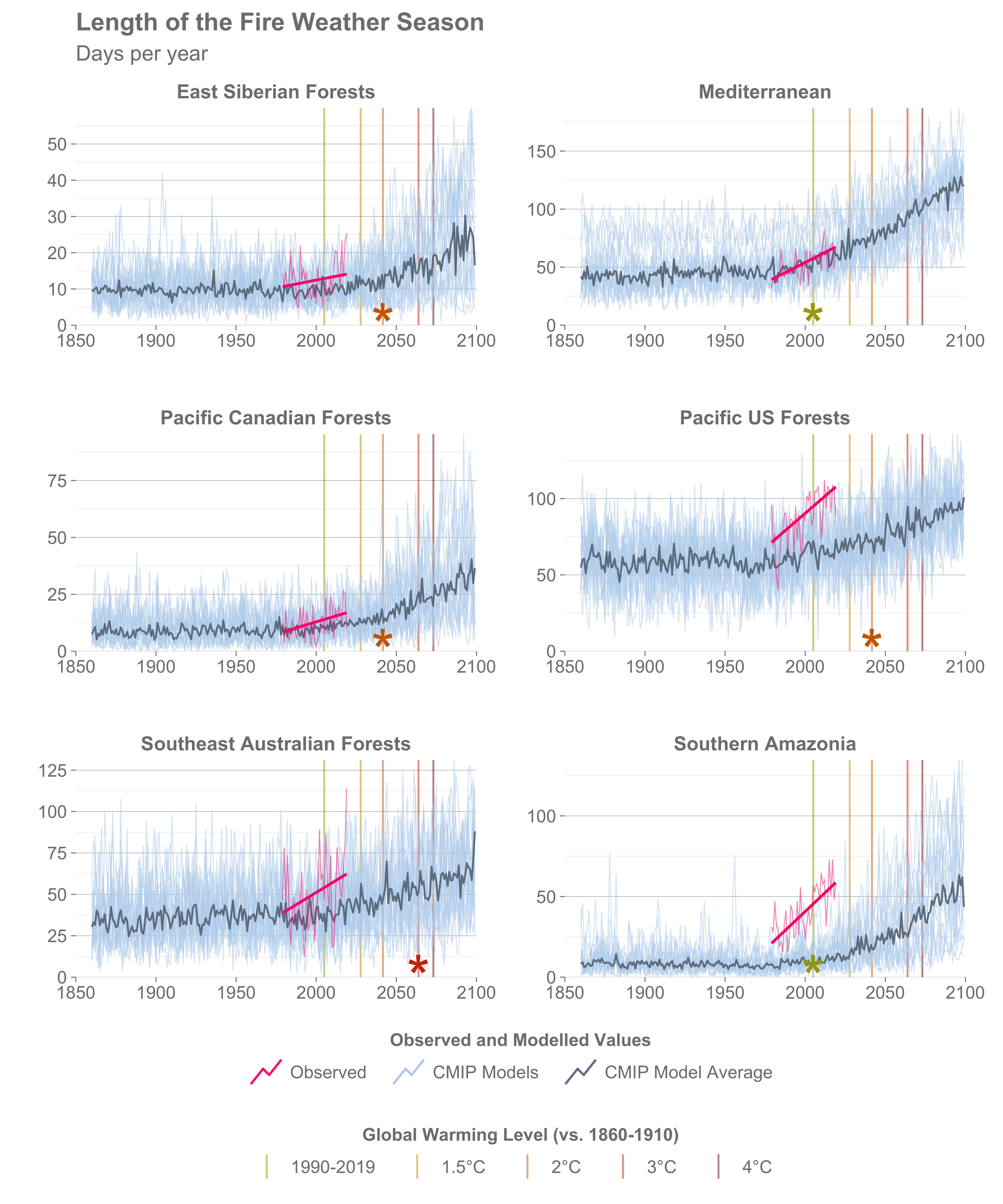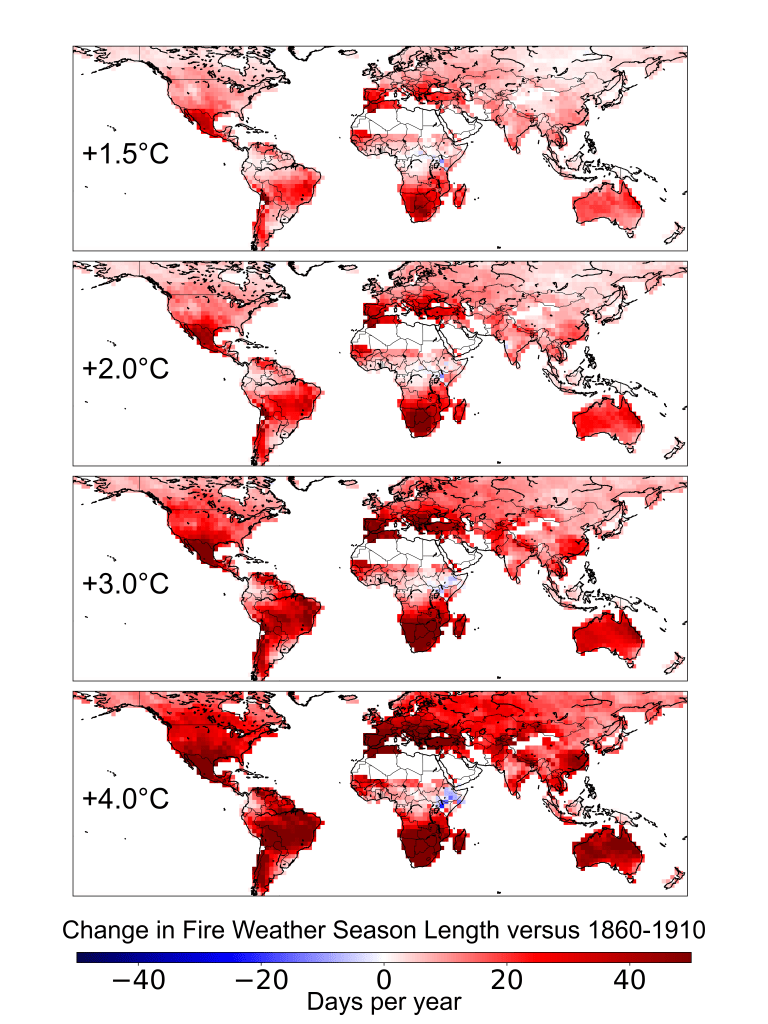 For these same regions, future changes in fire weather are examined at policy-relevant warming increments of 1.5°C, 2°C, 3°C and 4°C, providing insight into how the success or failure of climate policies correspond to the risks of wildfire we will need to live with in future.
